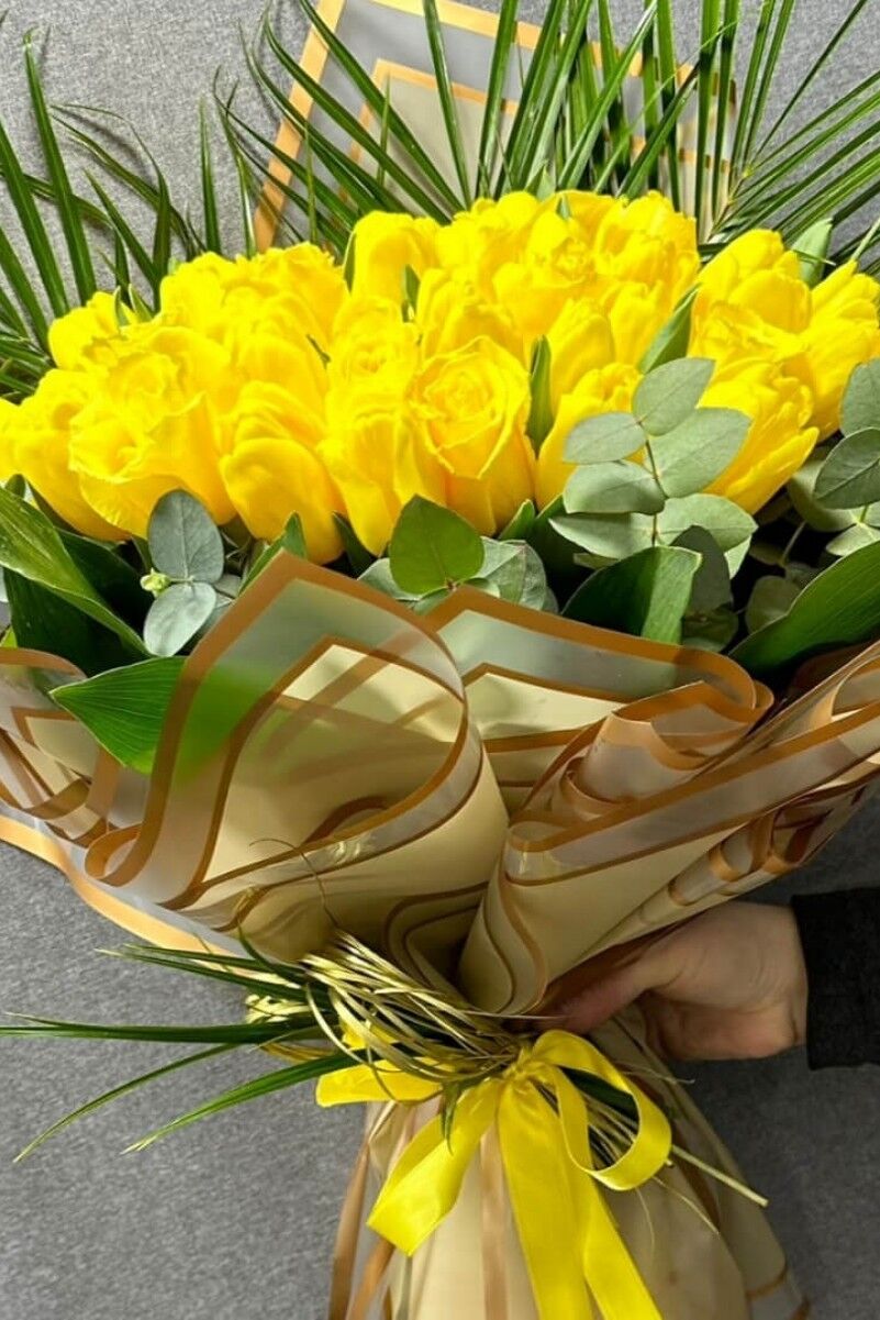 41 adet sarı lale ve özenle seçilmiş farklı yeşilliklerle hazırlanan bu buket, canlı renkleri ve zarif tasarımıyla dikkat çeker. Sarı lalelerin neşeli tonları, doğal yeşilliklerin taze dokusu ile birleşerek ferahlatıcı bir atmosfer yaratır. Hem enerjik hem de şık bir görünüm sunan bu buket, her mekâna zarif ve göz alıcı bir hava katar.