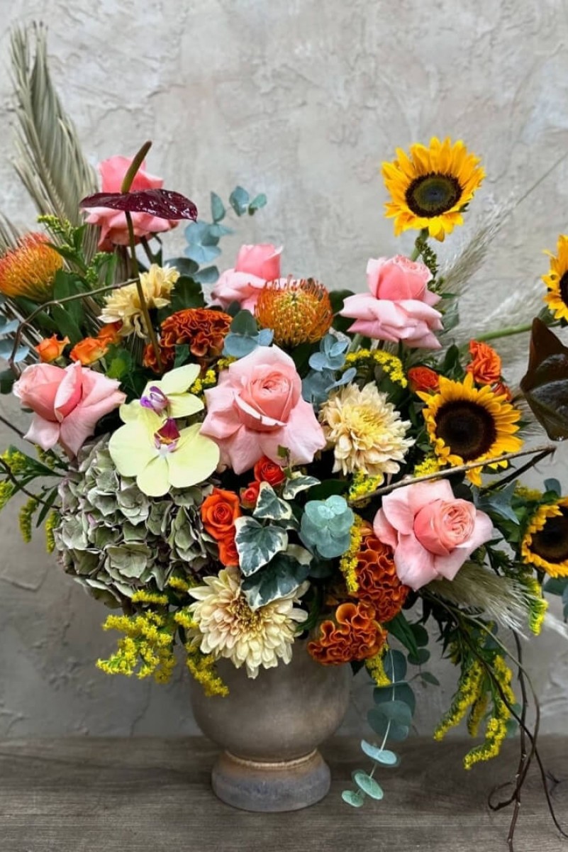 Lukesperium, ay çiçeği, ithal özel güller, orkide, anastasia, antoryum ve ithal yeşilliklerle hazırlanan bu sonbahar aranjmanı, mevsimin sıcak renklerini zarif bir şekilde yansıtır. Doğal dokular ve göz alıcı çiçeklerle her mekânda şıklık yaratacak etkileyici bir tasarım.